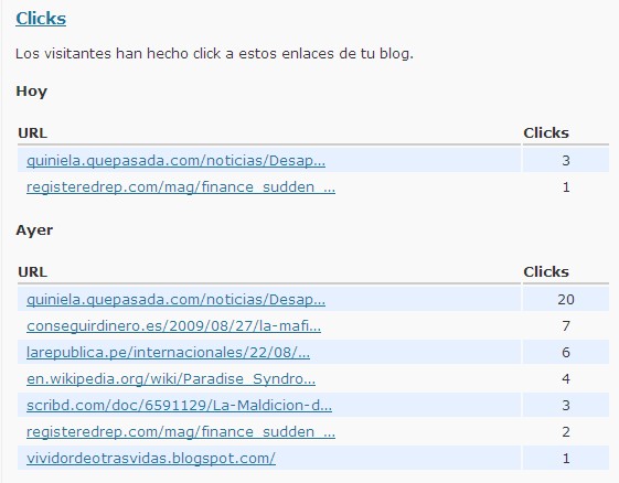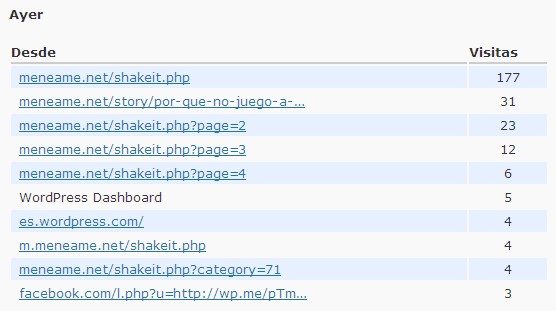 Normalmente, dedico mucho más tiempo a buscar referencias que apoyen lo que digo (estadísticas, noticias, artículos…) que a redactar. Pero lo cierto es que a penas se les presta atención a esos enlaces. Sirva esto como ejemplo, de las más de 350 visitas recibidas, aproximadamente 1 de cada 14 (el 7%) pinchó en el enlace más consultado (y es muy probable que fueran los mismos los que pincharon en alguno de los otros):
