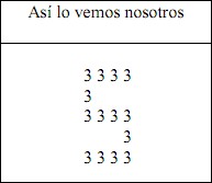 Él podría ver dos imágenes alternativas, en dos colores distintos, en función de si conscientemente prestara atención al dibujo general que hacen (un cinco) o a cada uno de los elementos que lo conforman (treses). Es decir: