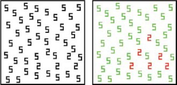 Esta característica le puede servir a un sinestésico, por ejemplo, para memorizar más fácilmente y de un golpe de vista determinadas cosas ya que, de algún modo, «ven» más y por lo tanto pueden relacionar mejor. Por ejemplo, ¿quién creéis que captará más fácilmente cuantos doses hay entre esos cincos en el dibujo de abajo? ¿Un no-sinestésico (izquierda) o uno que sí lo es (derecha)?: