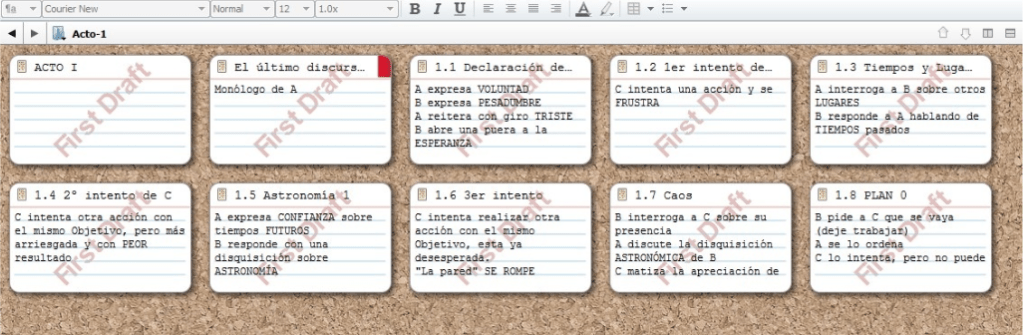Así que dediqué la tarde a construirme una «microestructura» completa para toda la obra. Detalle cada tipo de acción y de parlamento entre tres personajes a los que llamé A, B y C y de los que no sabía absolutamente nada. Ni quienes eran, ni qué les ocurría, ni que relación había entre ellos. De alguna manera, podríamos decir, me construí un «ejercicio literario» que luego pudiera resolver por mí mismo.