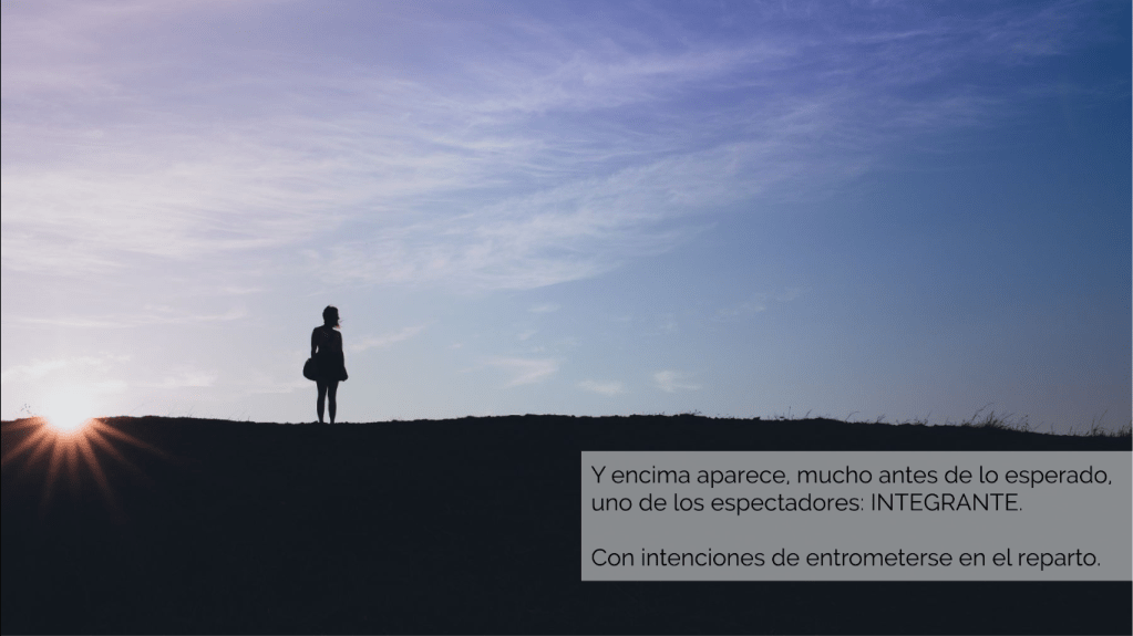 Lo único que tenía claro desde casi el principio es que, si algo puede hacer el teatro respecto a otros artes, es que está plenamente vivo. Es capaz de proporcionar una experiencia inmersiva. Y estábamos hablando de participación, carajo. Decidí que la obra sólo se podría resolver «de manera satisfactoria» si el público se involucraba.