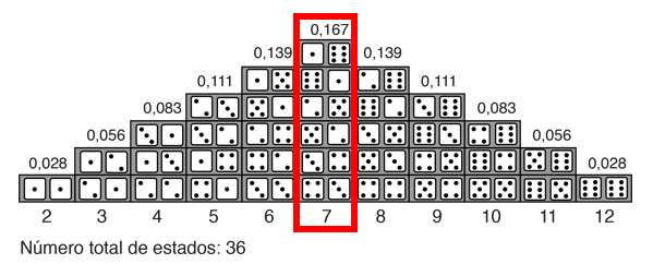 Un ejemplo rápido: Puede que no sepamos cual va a ser el resultado de tirar un dado. Pero sí sabemos que si tiramos dos dados, lo más probable es que sus caras sumen siete. Porque es la suma que admite más combinaciones posibles, 6 de 36 posibles (el 16’7%), las que señalo en rojo: